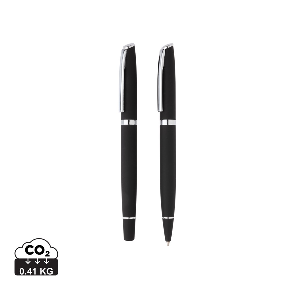 Schlicht und elegant. Das matte Finish dieses Stifte-Sets verleiht ihm ein besonders luxuriöses Erscheinungsbild und ist auch haptisch ein Highlight. Das Set, bestehend aus einem Kugelschreiber und einem Tintenroller, haben beide eine Mine mit blau schreibender Dokumental® Tinte. Der Kugelschreiber schreibt 1200m, der Tintenroller 400m. Verpackt in farblich passender Geschenkbox.