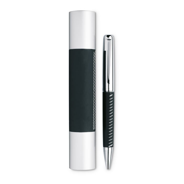 Metallkugelschreiber mit silber verchromten Enden und Lederapplikationen. Mit passender Aluminiumbox. Schwarze Tinte.