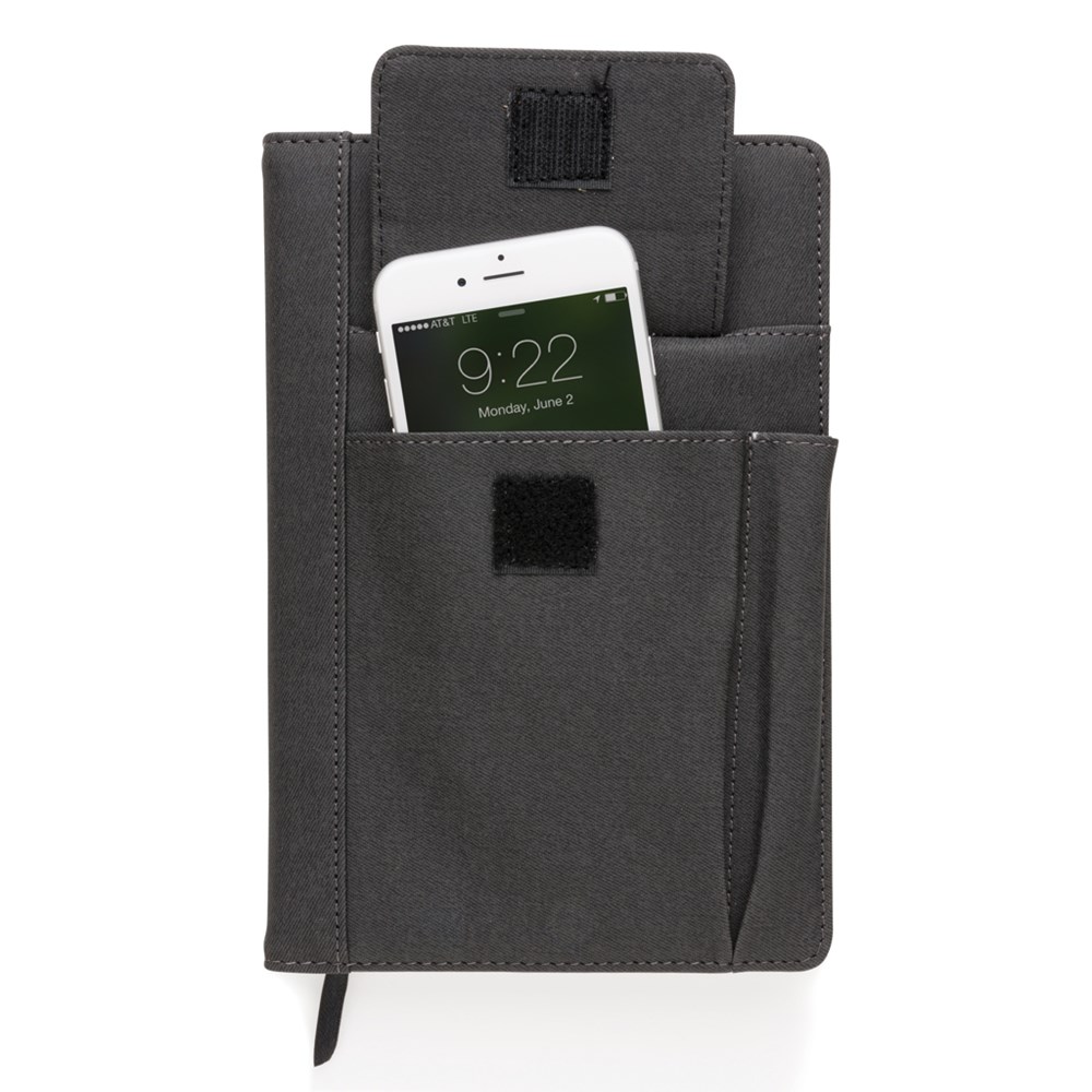 Beschichtetes PU Notizbuch mit Telefontasche (14 x 10 cm), Stifthalter und Hauptfach für z.B. eine Powerbank oder Visitenkarten. Schwarzer Seitenteiler und 160 linierten Seiten aus 80g/m2. Mit neuem A5 Notizbuch kann das Cover stets wiederverwendet werden.