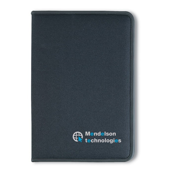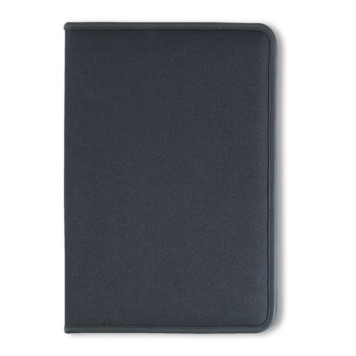 DIN A4 Dokumententasche mit Reißverschluss. 600D Polyester und 210T Futter. DIN A4 Notizblock mit 20 Blatt (40 Seiten) liniertem Recyclingpapier. 4 Fächer und Visitenkartenhalter.