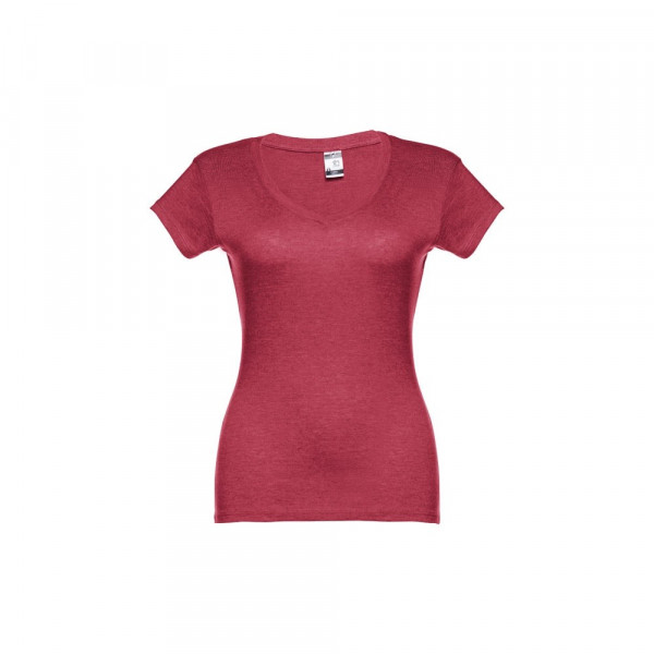 Damen T-Shirt aus 100% Strickjersey und Baumwolle (150g/m²) mit kardiertem Baumwollfaden, tailliert, überlapptem V-Ausschnitt, Verstärkungsband, Jersey-Kragen und Doppelnaht an Ärmeln und Saum. Bei den Farben 194, 195 und 199 bestehend aus 60% Baumwolle und 40% Polyester. Größen: S, M, L, XL, XXL