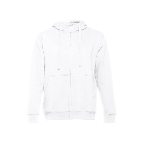 Herren Sweatshirt aus 50% Baumwolle und 50% Polyester (320 g/m²) mit kardierter Innenseite. Die Kapuze ist gefüttert und hat eine farblich abgestimmte Kordel. Auf der Vorderseite befinden sich 2 Beuteltaschen mit verdecktem Plastikreissverschluss. Ripp an Bund und Ärmeln. Größen: S, M, L, XL, XXL
