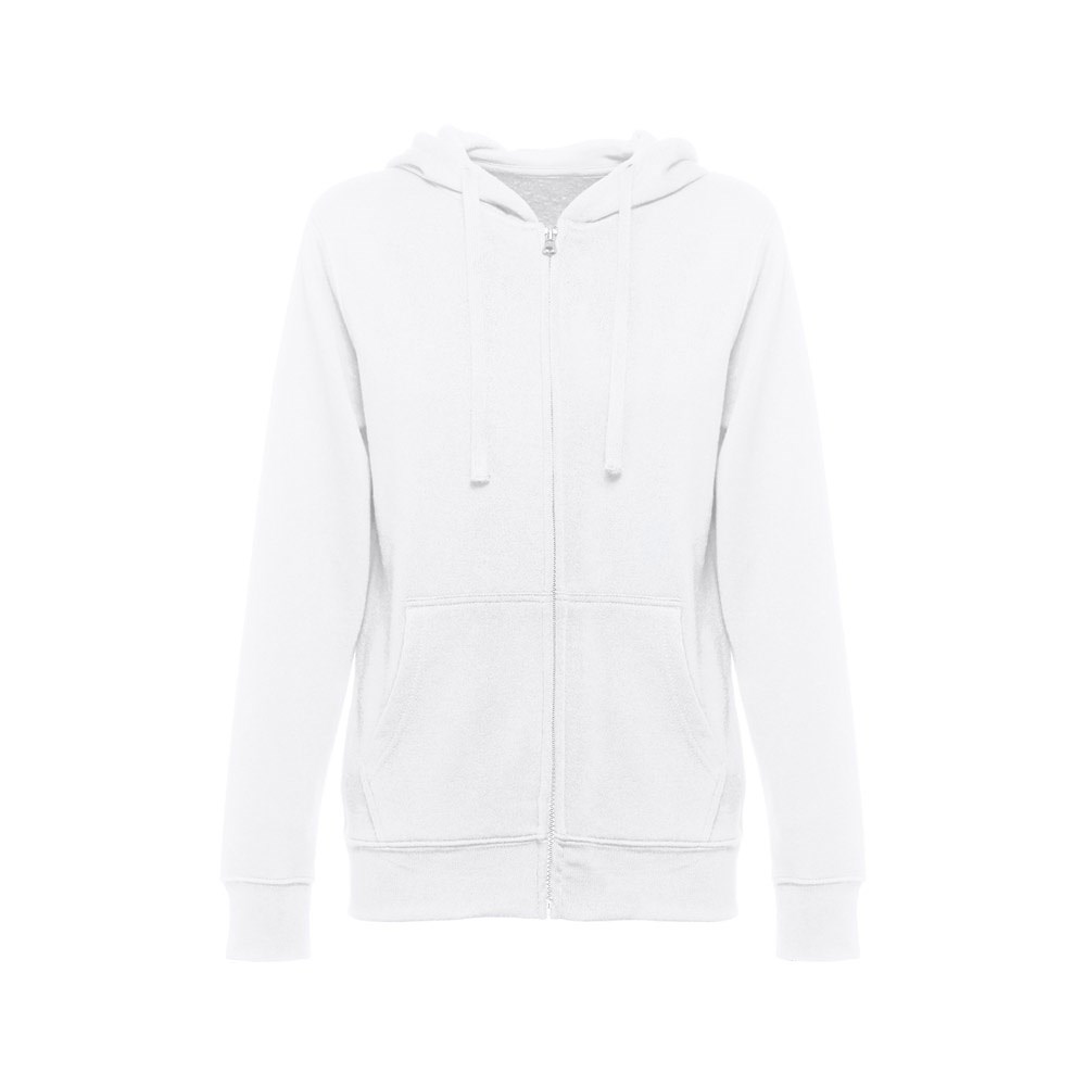 Damen Sweatshirt aus 50% Baumwolle und 50% Polyester (320 g/m²) mit kardierter Innenseite. Die Kapuze ist gefüttert und hat eine farblich abgestimmte Kordel. Auf der Vorderseite befinden sich 2 Beuteltaschen mit verdecktem Plastikreissverschluss. Ripp an Bund und Ärmeln. Größen: S, M, L, XL, XXL