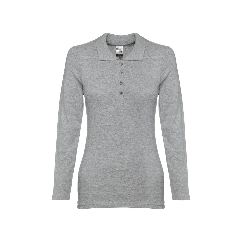 Damen langarm Poloshirt aus Piqué Stoff 100% kardierter Baumwolle (210g/m²) mit geripptem Kragen und Ärmelbund, Verstärkungsband am Kragen und verstärkte Knopfleiste mit 4 farblich abgestimmten Knöpfen und mit einem Ersatzknopf an der Innennaht. Unten mit seitlichen Öffnungen. Bei der Farbe 183 bestehend aus 85% Baumwolle und 15% Viskose. Etikett ist abreissbar. Größen: S, M, L, XL, XXL