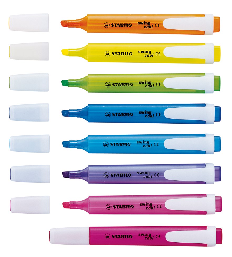 COOL & PRAKTISCH FÜR UNTERWEGS. Flacher Textmarker in Taschengröße mit praktischem Clip. 2 Strichstärken für verschiedene Arten des Markierens. Erhältlich in 8 trendigen Farben.