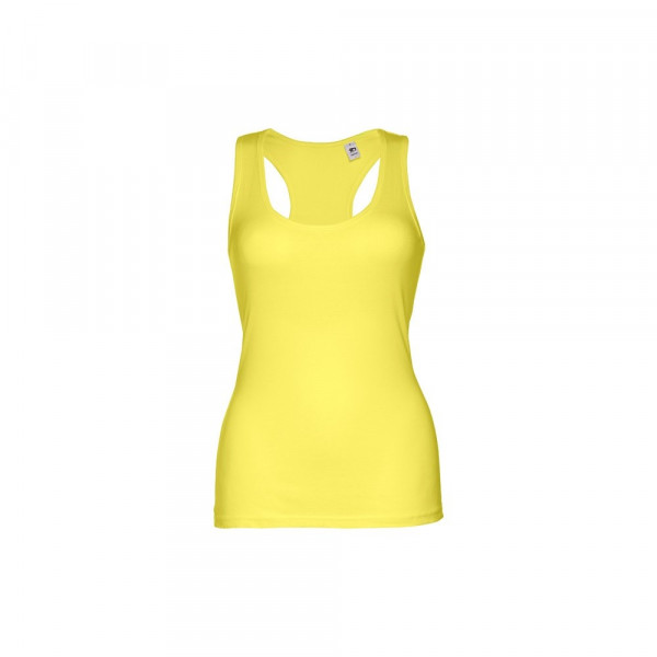 Damen Tank Top aus 100% Strickjersey und Baumwolle (160g/m²) mit kardiertem Baumwollfaden und" T"-Ausschnitt am Rücken. Doppelnaht am Saum, an den Armlöchern und Ausschnitt. Größen: S, M, L, XL, XXL