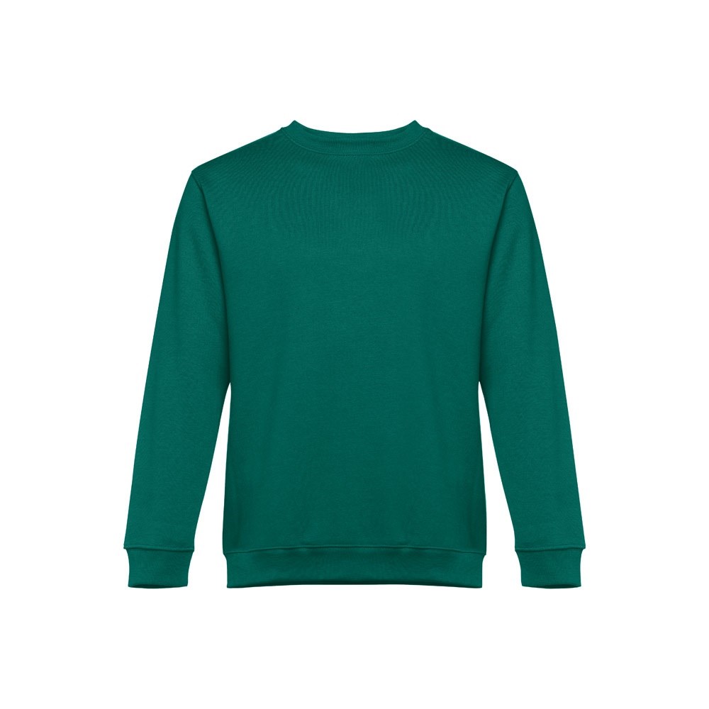 Sweatshirt aus 50% Baumwolle und 50% Polyester (300g/m²), unisex. Innen kardiert, 1x1 Ripp, Bund am Ärmel und Saum, Doppelnaht und Verstärkungsband am Kragen. Größen: S, M, L, XL, XXL
