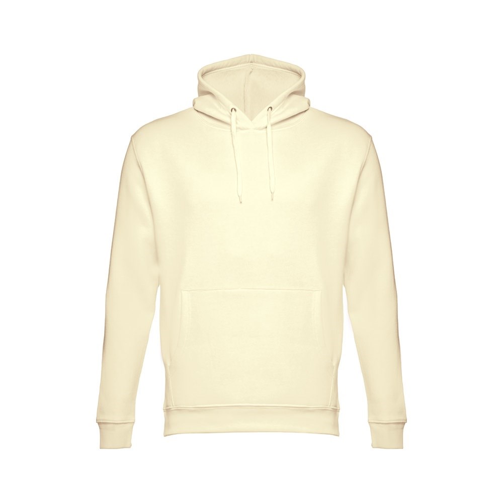 Sweatshirt aus 50% Baumwolle und 50% Polyester (320g/m²), unisex mit einer Kapuze mit Kordelzug. Innen kardiert, 1x1 Ripp, Bund an Ärmel und einer Kängurutasche. Größen: XS, S, M, L, XL, XXL
