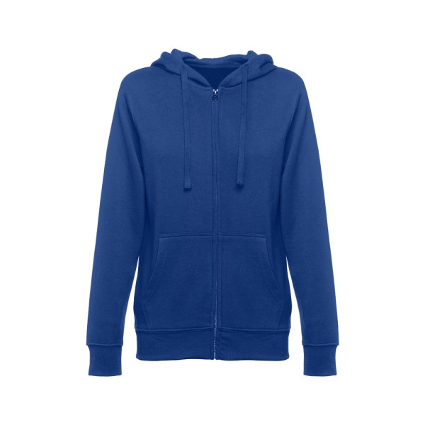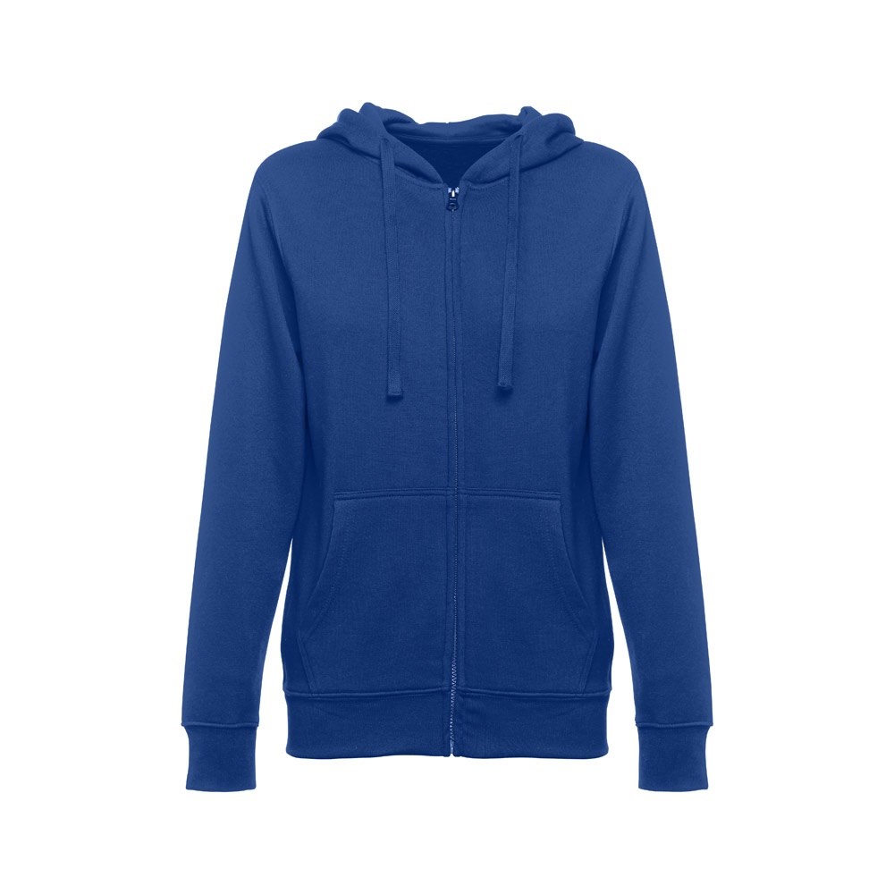 Damen Sweatjacke aus 50% Baumwolle und 50% Polyester (320g/m²) mit Reißverschluss und gefütterter Kapuze mit Kordelzug. Kardiert mit 2 Kängurutaschen, einem verdeckten Kunststoffreißverschluss und einem gerripten Bund. Größen: S, M, L, XL, XXL
