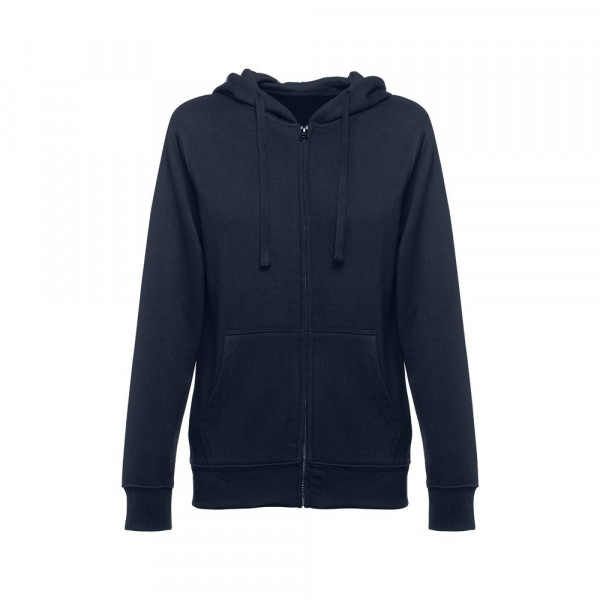Damen Sweatjacke aus 50% Baumwolle und 50% Polyester (320g/m²) mit Reißverschluss und gefütterter Kapuze mit Kordelzug. Kardiert mit 2 Kängurutaschen, einem verdeckten Kunststoffreißverschluss und einem gerripten Bund. Größen: S, M, L, XL, XXL