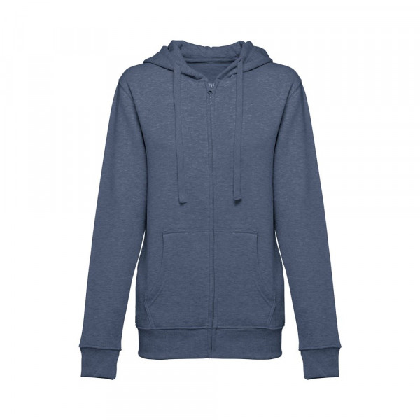 Damen Sweatjacke aus 50% Baumwolle und 50% Polyester (320g/m²) mit Reißverschluss und gefütterter Kapuze mit Kordelzug. Kardiert mit 2 Kängurutaschen, einem verdeckten Kunststoffreißverschluss und einem gerripten Bund. Größen: S, M, L, XL, XXL