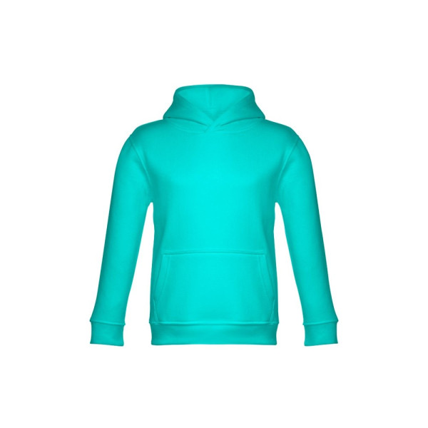 Kinder Sweatshirt aus 50% Baumwolle und 50% Polyester (320g/m²), unisex mit Kapuze in Jersey. Innen kardiert, Ripp 1x1 an Ärmelbündchen und Bund und einer Kängurutasche. Kapuze in Übereinstimmung mit den Sicherheitsstandards der Europäischen Union. Größen: 2, 4, 6, 8, 10, 12