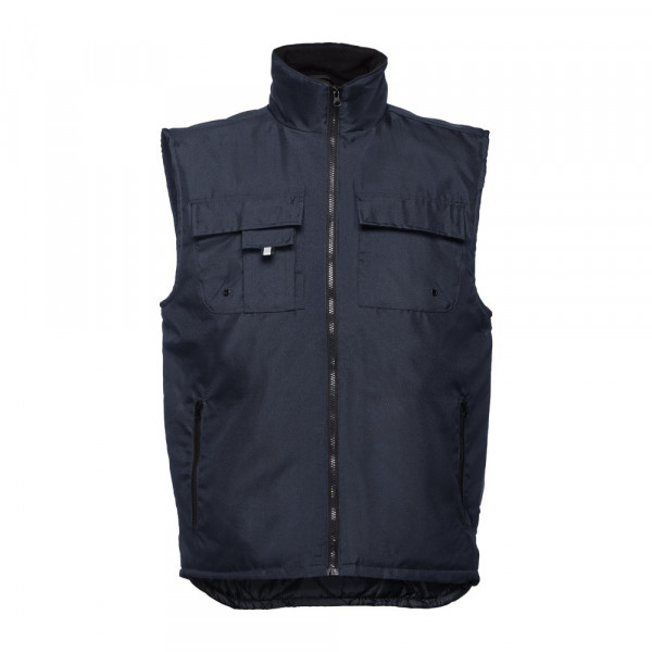 Herren Arbeitsweste aus 100% Polyester mit Acrylbeschichtung (170g/m²), gepolstert und gefuttert. Innenseite aus 100% Polyester-Taft (65g/m²) mit Polar Fleece Kragen. Die Weste hat 6 Taschen, 5 Taschen auf der Vorderseite davon 2 Taschen mit Reißverschluss, 1 Tasche für das Handy und 1 Innentasche. Elastisches Band an den Seiten. Der Reißverschlusszugang auf der Rückseite vereinfacht die Veredelung. Größen: S, M, L, XL, XXL, 3XL