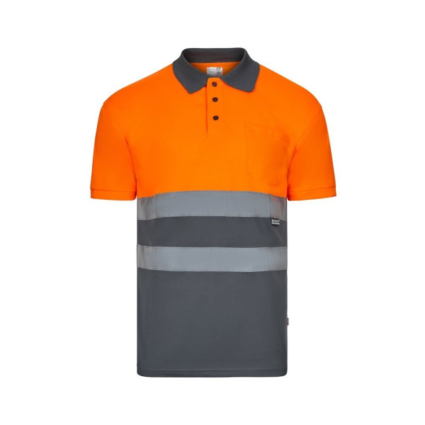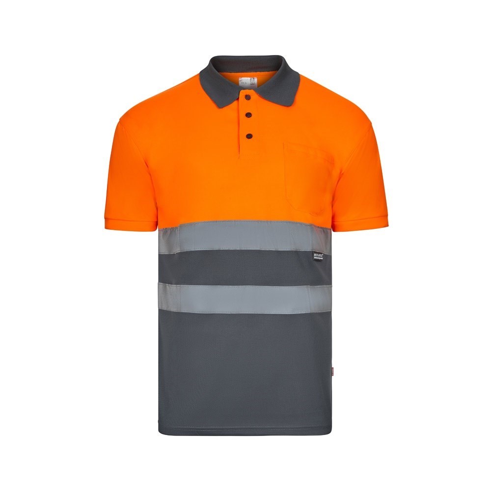 Zweifarbiges Poloshirt im Bird-Eye-Design (160g/m²) mit kurzen Ärmeln, aus Polyester (100%). Knöpfe und Kragen in Kontrastfarbe. Gerippter Kragen. Reflektierende Streifen auf dem Oberkörper. Inklusive einer Brusttasche. Produkt gemäß EU-Verordnung 2016/425, zertifiziert nach EN20471 und Klasse Nº 1. Größe: 4XL, 5XL