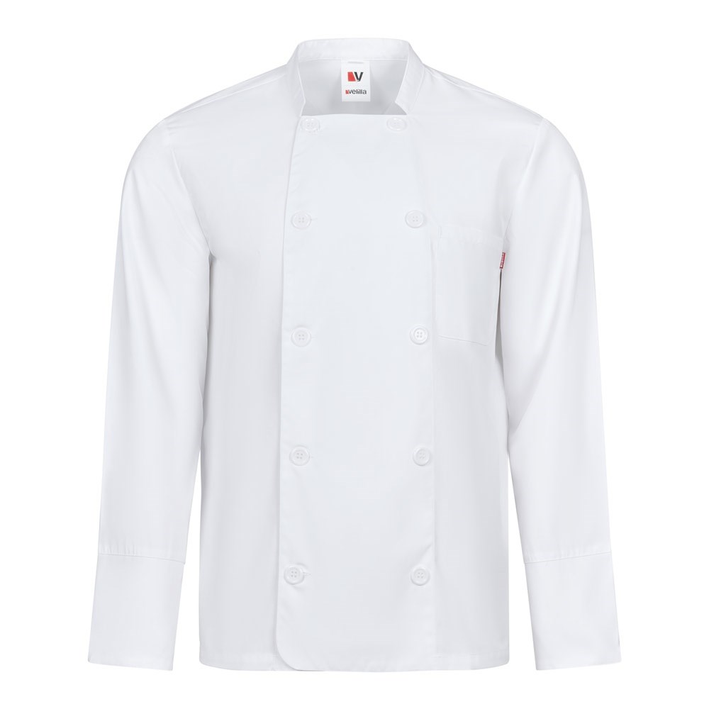 Langärmelige Kochjacke (175 g/m²), aus Baumwolle (35 %) und Polyester (65 %). Mit doppeltem Knopfverschluss, Öffnung an den Manschetten und 1 Brusttasche. Größe: 44, 46, 48, 50, 52, 54, 56, 58, 60, 62, 64