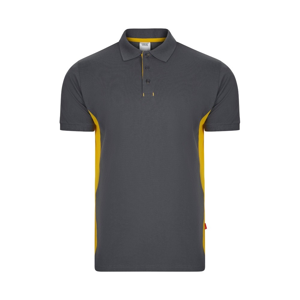 Two-tone piqué polo shirt (180g/m²), short sleeve, in cotton (60%) and polyester (40%). Mit Knopfverschluss, geripptem Kragen und unteren Ärmeln. Seiten und Knopfleiste in Kontrastfarbe. Größe: XS, S, M, L, XL, 2XL, 3XL