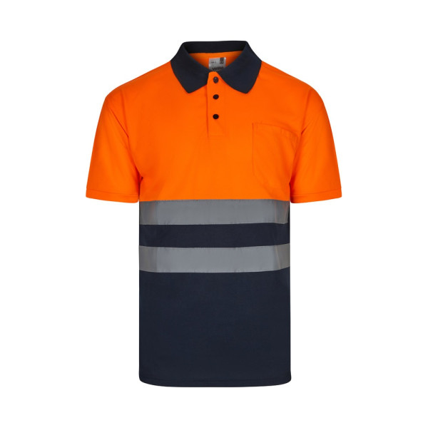 Poloshirt (140g/m²) im Bird-Eye-Design mit kurzen Ärmeln, aus Polyester (100%). Kontrastfarbene Knöpfe und gerippter Kragen. Reflektierende Streifen auf der Brust und eine Brusttasche. Produkt gemäß EU-Verordnung 2016/425, zertifiziert nach EN20471 und Klasse Nº 1. Größe: S, M, L, XL, 2XL, 3XL
