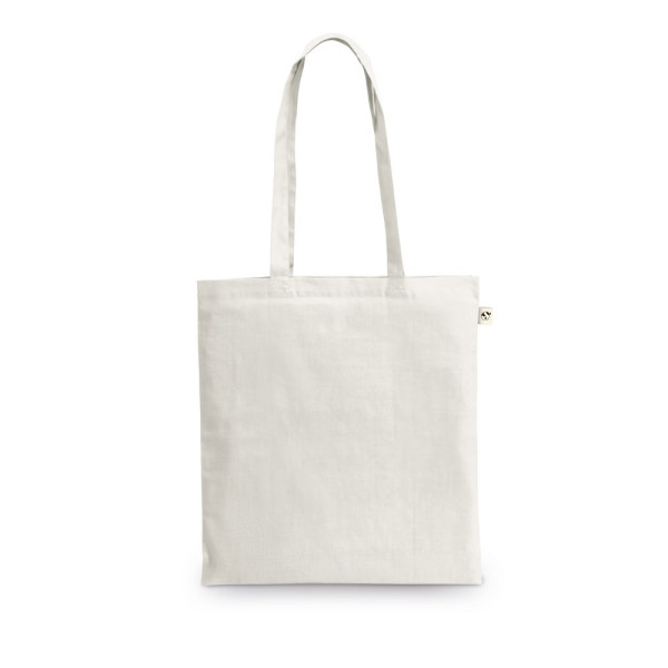 Tasche aus recycelter Baumwolle (70%) und Polyester (30% rPET) (150 g/m²), mit 65 cm langen Griffen. Recycelte Baumwolle ist einfarbig und ungefärbt. Das Rohmaterial wird in seiner ursprünglichen Form und Farbe verwendet, ohne dass Chemikalien zum Färben oder Bleichen eingesetzt werden, was zu einer geringeren Umweltbelastung beiträgt. Die einheitliche Farbe wird durch die Auswahl von recyceltem Garn mit demselben Farbton erzielt, wobei Verunreinigungen und Farbabweichungen auftreten können. 380 x 420 mm