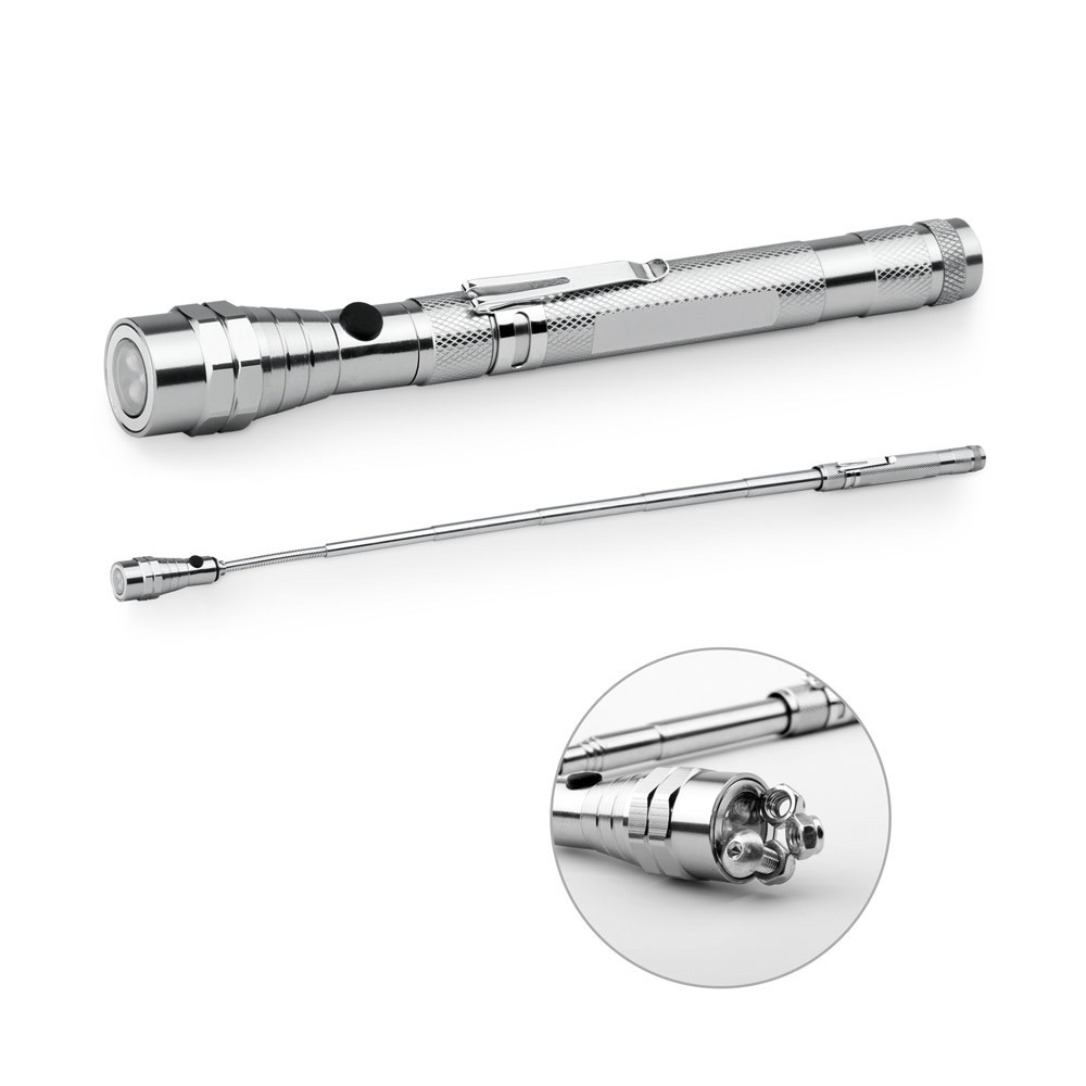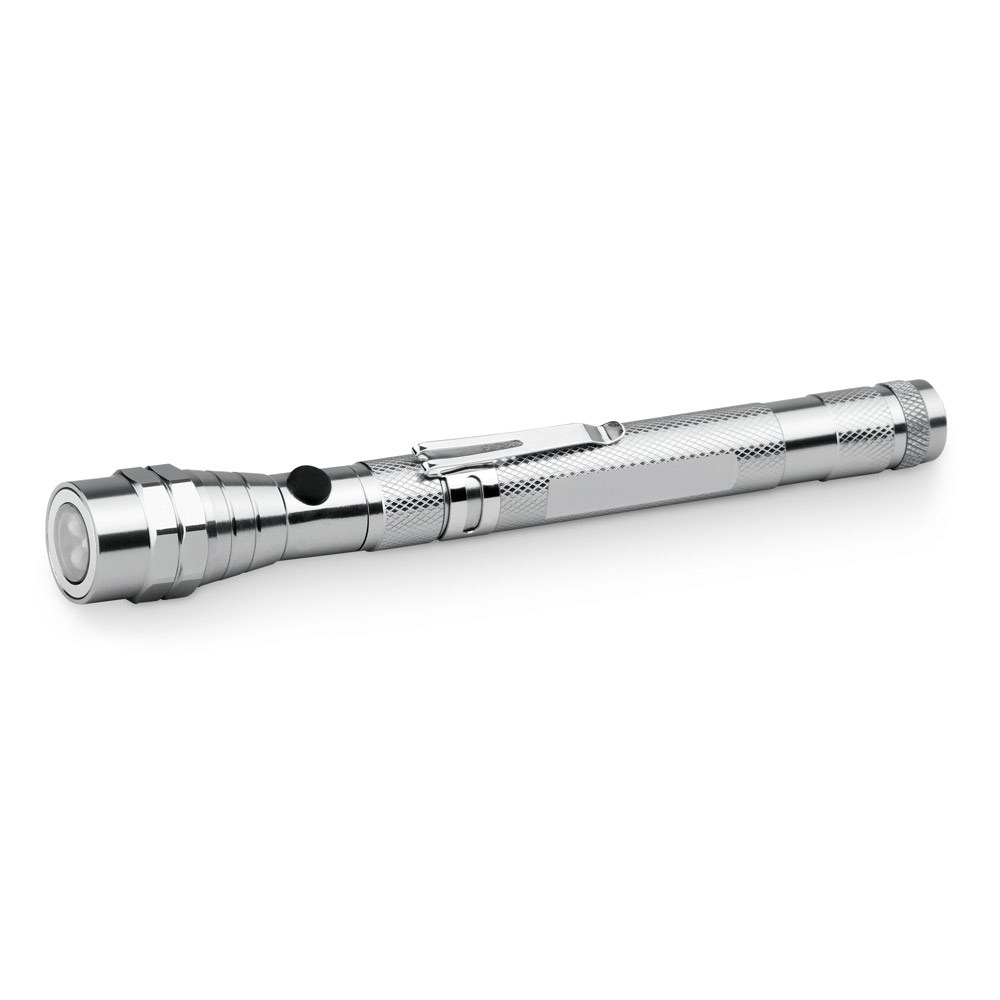 LED-Taschenlampe aus Metall, teleskopisch mit 3 LEDs (13 Lumen), einem Magnet und einem Clip. Inklusive 4 LR44 Lithium-Batterien. Geliefert in einer Schachtel. ø22 x 175 mm | Schachtel: 25 x 25 x 174 mm