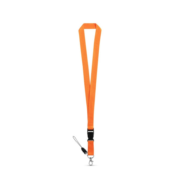 Lanyard aus Polyester, 20 mm breit mit einem Schlüsselband und einer abnehmbaren Schnalle. Karabinerhaken aus Metall. 20 x 530 mm