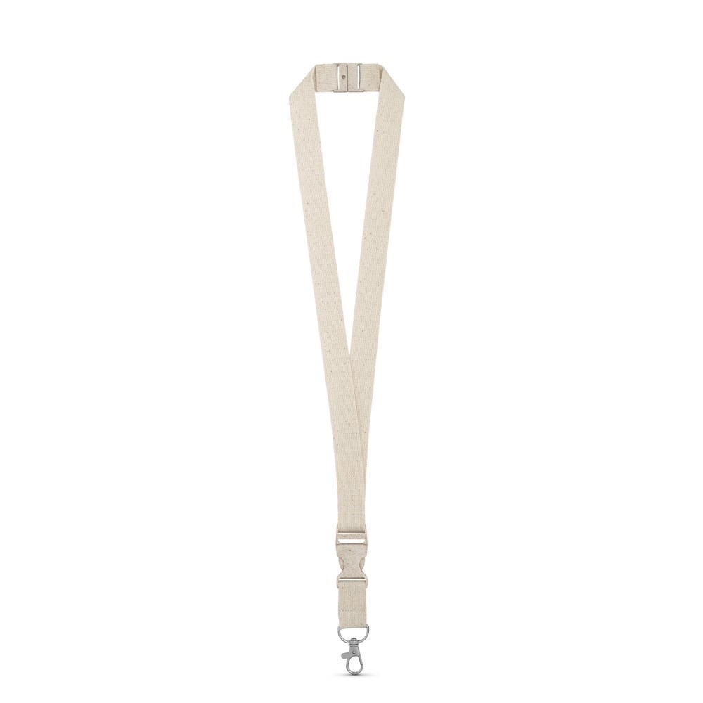 Lanyard aus 100% Baumwolle mit Metallkarabiner, einer abnehmbaren Schnalle aus Weizenstrohfaser und einem Sicherheitsverschluss. Hergestellt in Europa. 20 x 510 mm