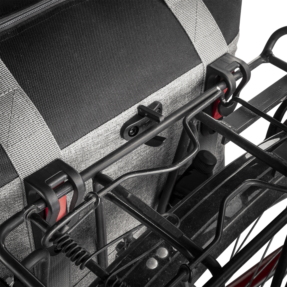 Diese Tasche ist aus robustem 600D Twotone Polyester und 600D PVC gefertigt, was ihr eine hohe Strapazierfähigkeit verleiht. Sie verfügt über ein Hauptfach mit 2-Wege-Reißverschluss und eine praktische Reißverschluss-Vortasche für zusätzlichen Stauraum. Mit Druckknöpfen an den Seiten lässt sich das Volumen flexibel erweitern. Die integrierte Kühlfunktion aus PEVA sorgt dafür, dass Lebensmittel oder Getränke länger frisch bleiben. Auf der Rückseite befindet sich ein Vario Top Haken von Rixen & Kaul, mit dem die Tasche sicher an einem Gepäckträger befestigt werden kann. Ideal für Ausflüge, Reisen oder den täglichen Gebrauch.