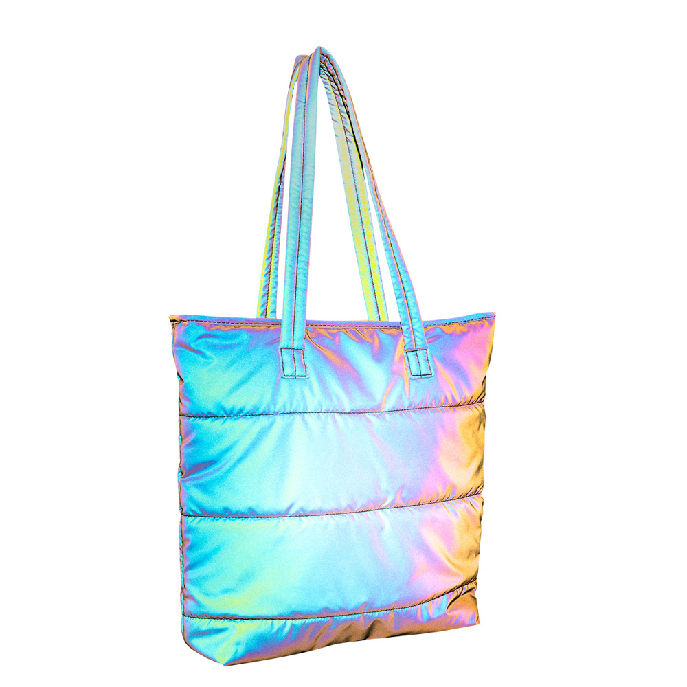 Dezent bei Tag – auffallend schön bei Nacht! Unsere praktische Tasche aus reflektierendem Puffer-Polyester mit 210D rPET Innenfutter vereint umweltfreundliche Vorteile mit modernem Stil. Bei Lichteinfall erstrahlt die LUMOS in schillernden Regenbogenfarben und sorgt so für einen echten Hingucker. Perfekt für alle, die sowohl Funktionalität als auch ein außergewöhnliches Design schätzen!