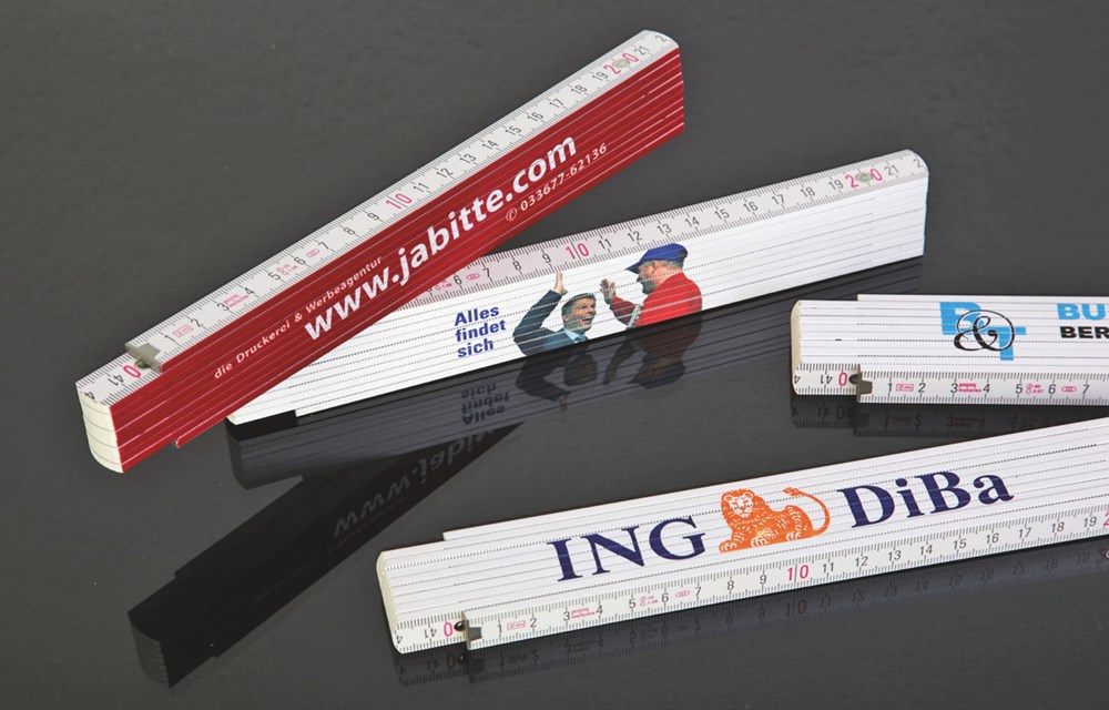 Buchenholz Gliedermaßstab in Spitzenqualität mit innenliegenden, federnden Metallgelenken für leichtgängiges Öffnen und Schließen aller Glieder. Zweifarbige Skalierung in schwarz und rot mit weissen Gliederenden. Hochwertige Tauchlackierung und bündig aufeinander liegende Glieder. Ideal für Mehrfarb- und vollflächigem UV-LED Digitaldruck geeignet.