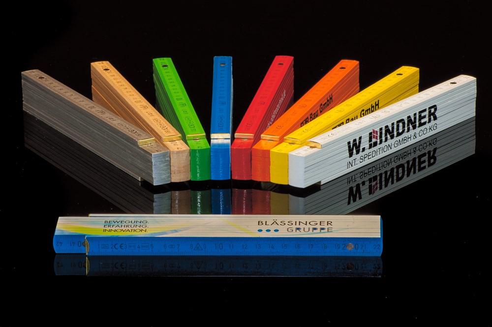 Buchenholz-Gliedermaßstab in guter Qualität mit schwarzer Skalierung.Durch innenliegende, federnde Metallgelenke liegen Glieder bündig aufeinander.8 Standardfarben gemäß Farbtabelle ab 100 Stück.Vollflächiger UV-LED-Digitaldruck auf den Hochseiten möglich.