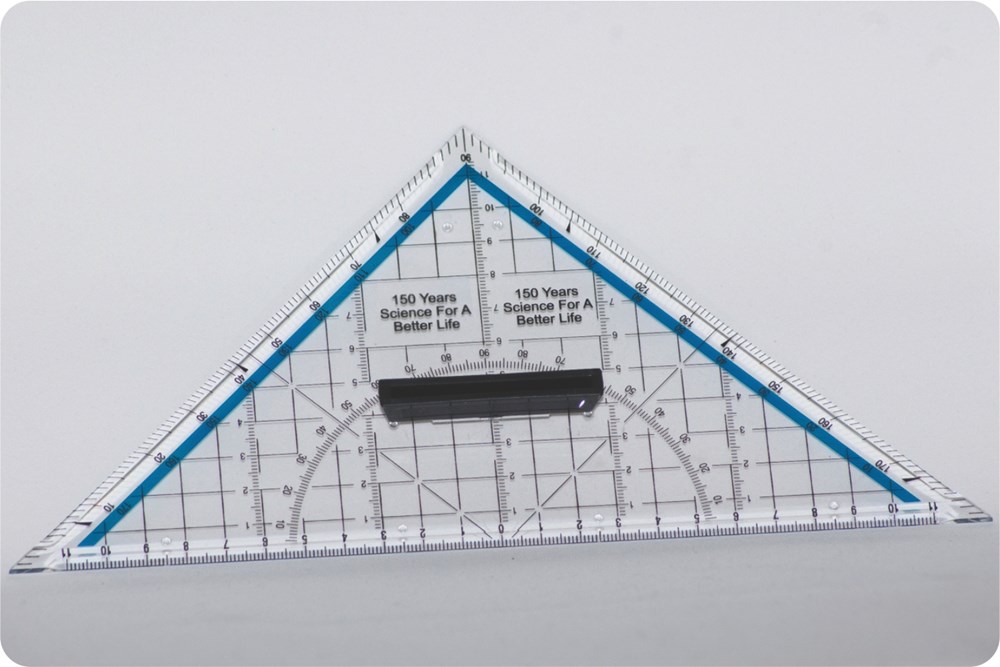 Geodreieck im Großformat (250 x 175mm) mit abnehmbaren Griff in schwarz, Skalierung in schwarz mit Farbstreifen gem. Pantone.Werbelogos werden individuell ins Skalierungssystem eingefügt.Sonderfarben (Pantone) für Farbstreifen ab 500 Stück.