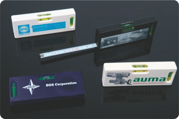 Bandmaß 2m mit integrierter Horizontal- und Vertikallibelle für Regale, Tische etc. Gehäuse aus schlagfestem ABS-Kunstsstoff auf UV-LED Digitaldruck geeignet. Made in Germany.