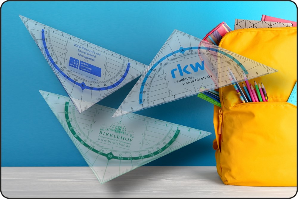 Geodreieck im klassischen Format 160 x 112mm mit schwarzer Skalierung und Gleitpunkten auf der Rückseite. Farbiger Halbkreis in der Standardfarbe gelb. Werbung erfolgt zwischen den Mittellinien. Ab 500 Stück Sonderanfertigung mit Halbkreis in jeder Pantonefarbe und freier Gestaltungsmöglichkeit lieferbar!