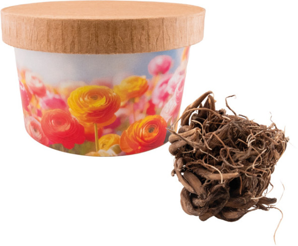 Die Ranunkeln entfalten im natürlichen Kraftpapierbecher ihre ganze Blütenpracht und bringen farbenfrohe Frische in Garten und Balkon. Präsentieren Sie Ihre Werbebotschaft auf der Banderole – ob mit Ihrem Logo oder einer individuellen Gestaltung, bereits ab 250 Stück. Inhalt: Erdtablette, Samen: 2 Ranunkeln-Zwiebeln
