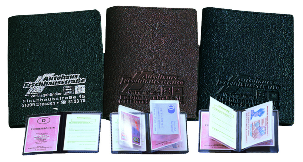 Solide Führerscheintasche aus wertigem Kunstleder mit 4 Klarsichtfächern, offenkantig.
