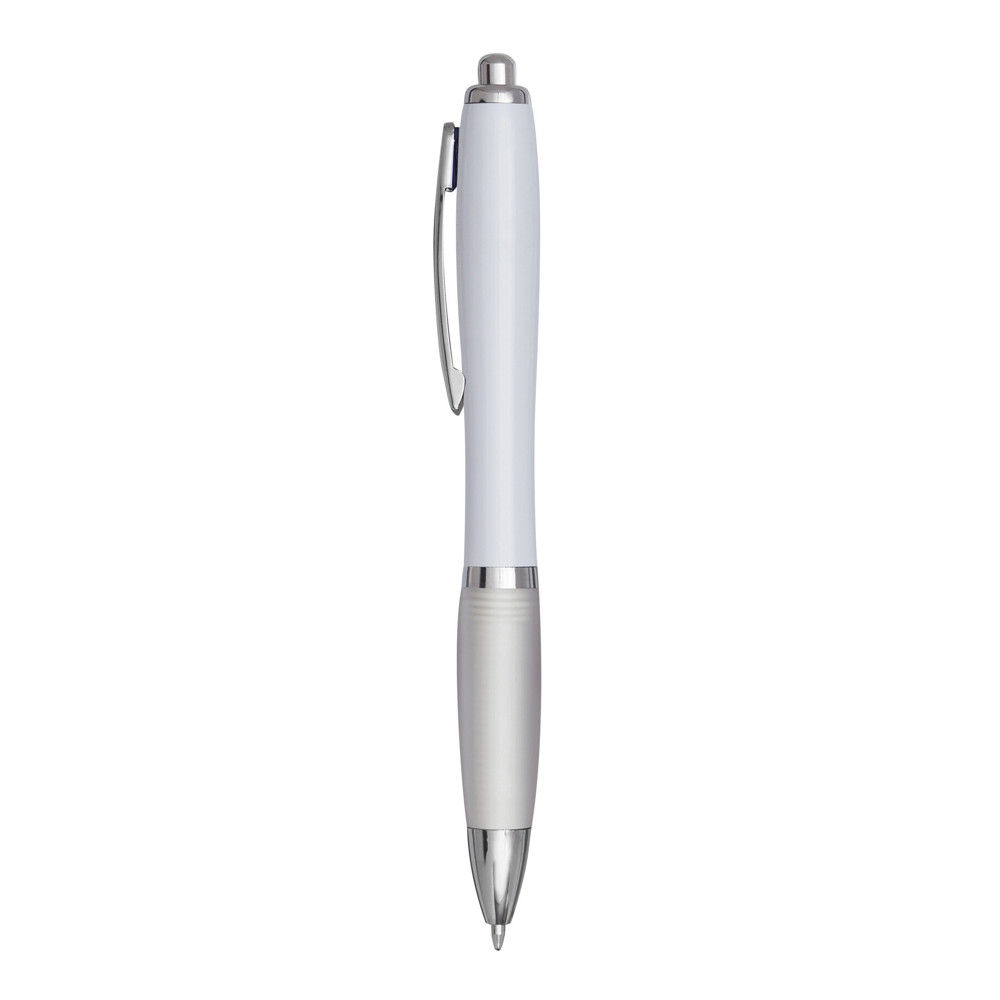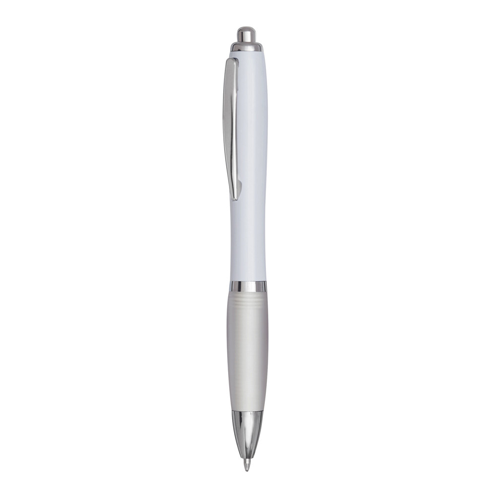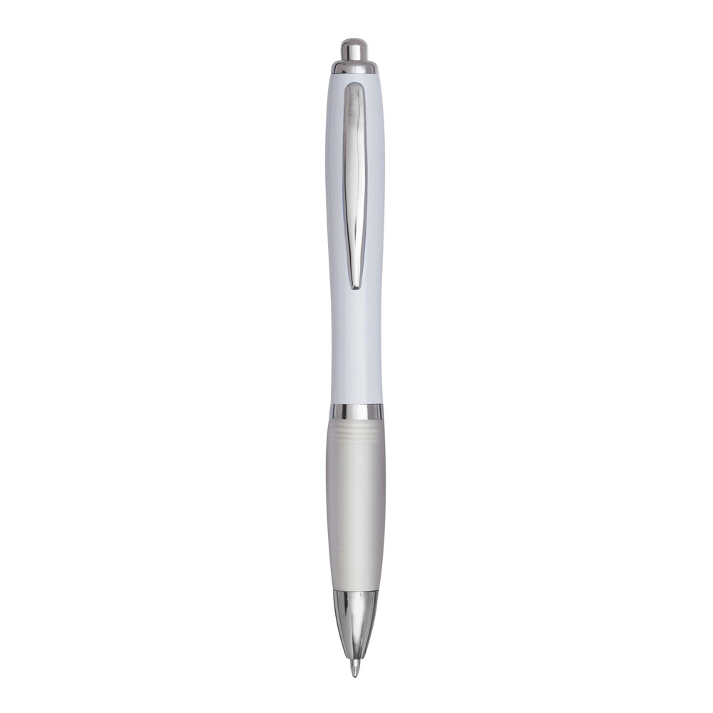 Kugelschreiber SWAYRABS: mit Schaft in taillierter Form aus recyceltem Kunststoff, gummierter Griffzone, Druckmechanismus, Großraummine, blauschreibend