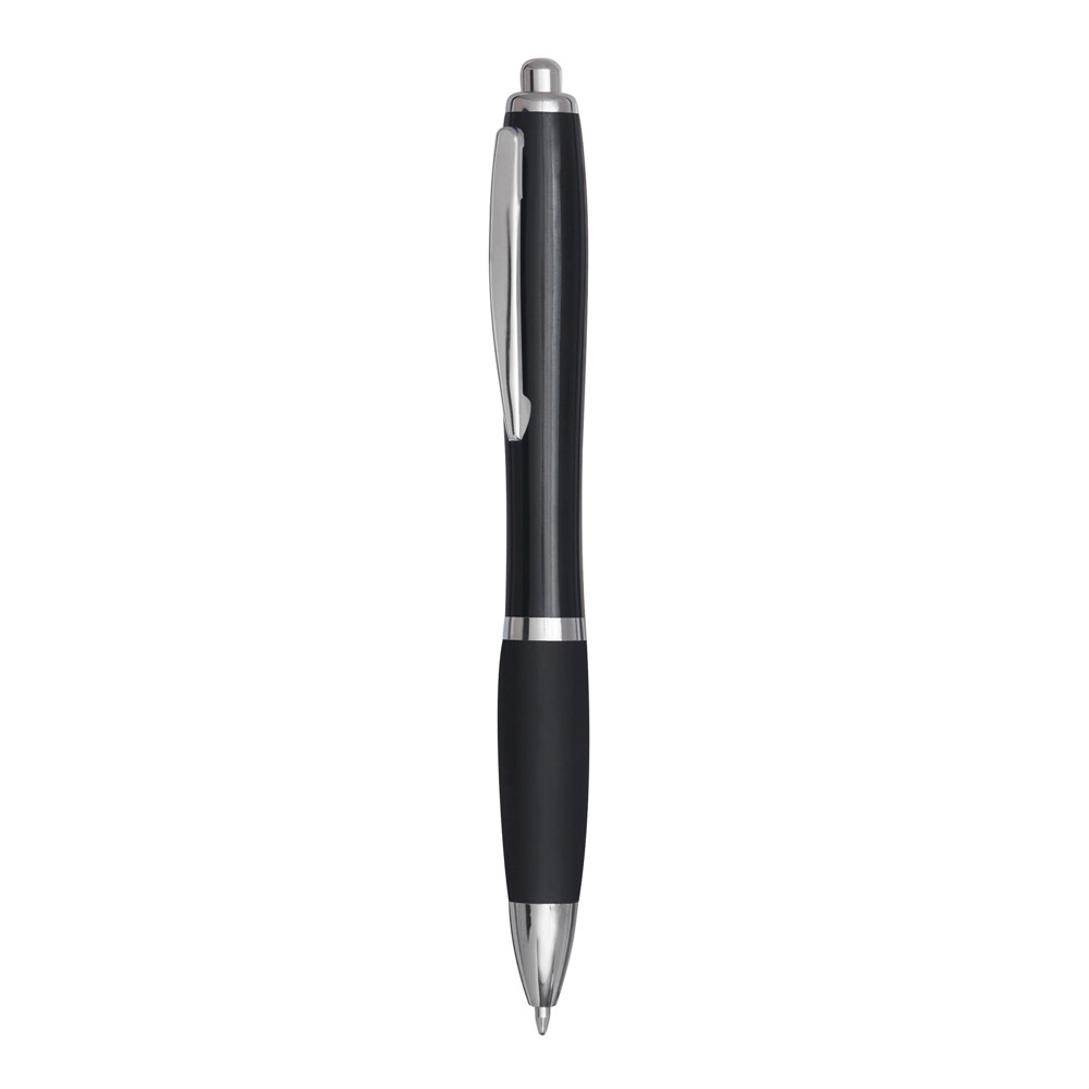 Kugelschreiber SWAYRABS: mit Schaft in taillierter Form aus recyceltem Kunststoff, gummierter Griffzone, Druckmechanismus, Großraummine, blauschreibend