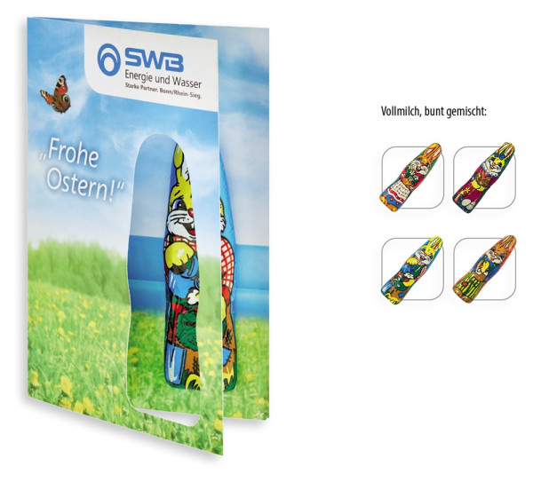 Faltkarte mit individuellem Druck - Schokofigur 1 Stück , Inhalt: Figur aus Edel-Vollmilchschokolade (Osterhase)