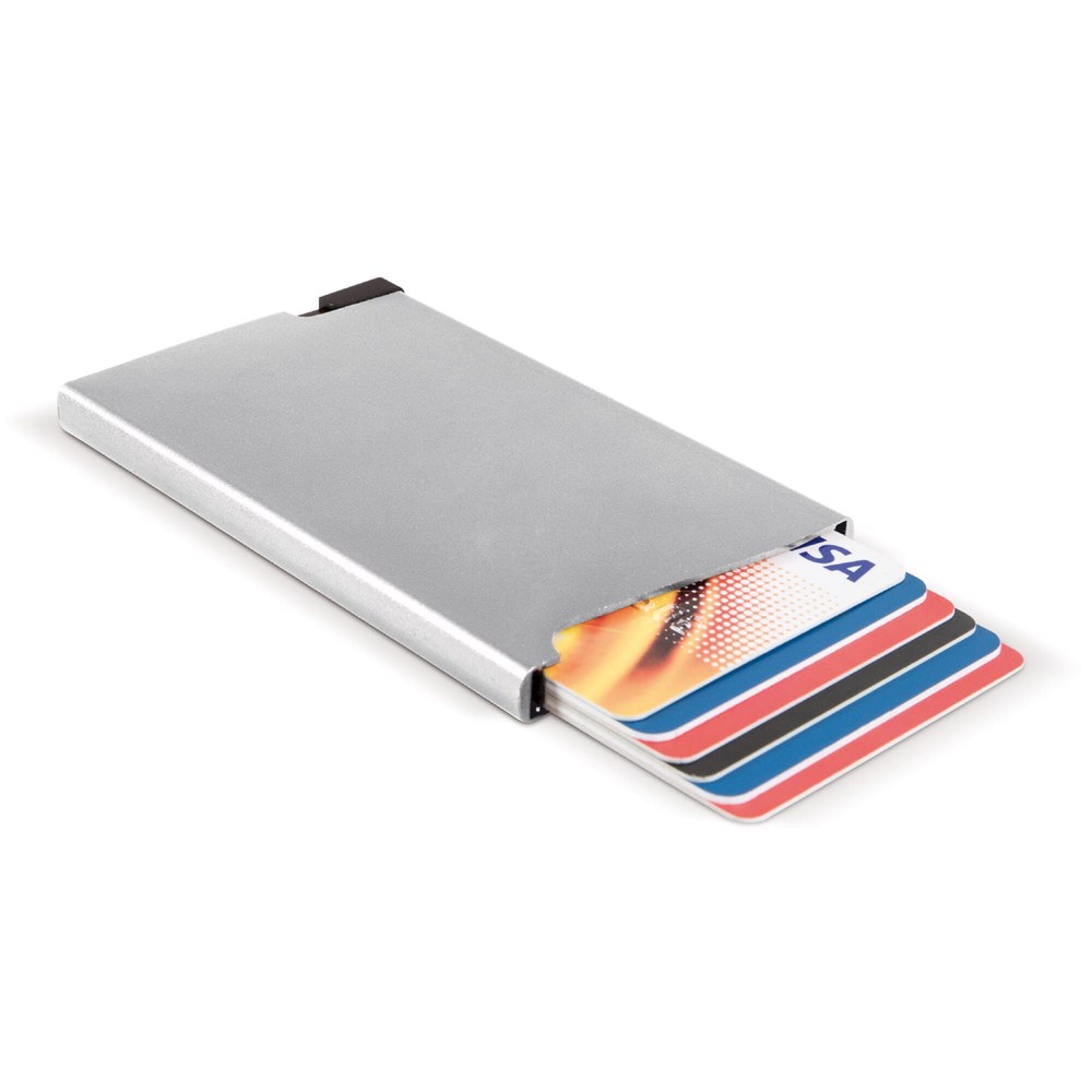 Hochwertiger Aluminium Kartenhalter zum Schutz Ihrer Karten vor RFID-Skimming. Einfach den Knopf drücken und bis zu 6 Karten (4 mit Prägung) abrufen.
