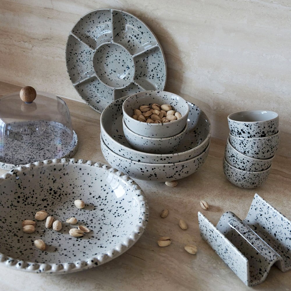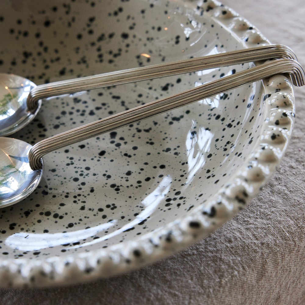 Eine große Servierschale für Salat, Brot oder Obstsalat. Die Farbe ist ein Beige-Grau-Ton mit einem hübschen Spritzmuster in Schwarz. Der Rand ist mit kleinen Quadraten verziert, die dem gemeinsamen Essen das gewisse Etwas verleihen. Hergestellt aus Steingut. Ditte ist handgefertigt, daher können Farbe und Oberfläche von Produkt zu Produkt variieren. Jedes Produkt ist einzigartig in seinem Aussehen.