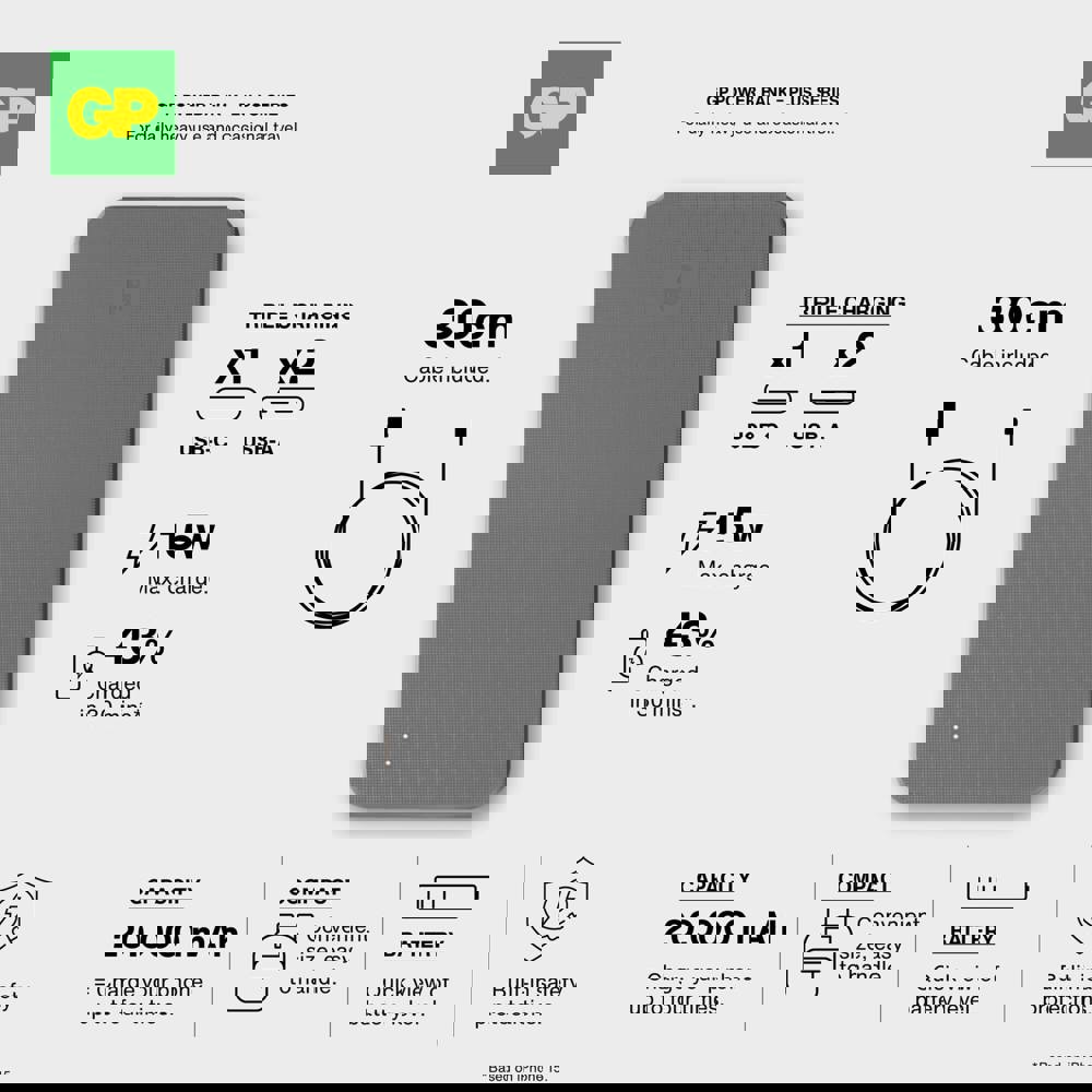 Die GP Powerbank kombiniert eine zuverlässige Stromversorgung mit einem eleganten Design. Mit einer Kapazität von 20000 mAh ermöglicht sie das gleichzeitige Laden von drei Geräten über 2x USB-A und 1x USB-C. Die Powerbank verfügt über einen 8-fachen Schutz für eine sichere Nutzung und garantierte Langlebigkeit. Ideal für den professionellen und alltäglichen Gebrauch.