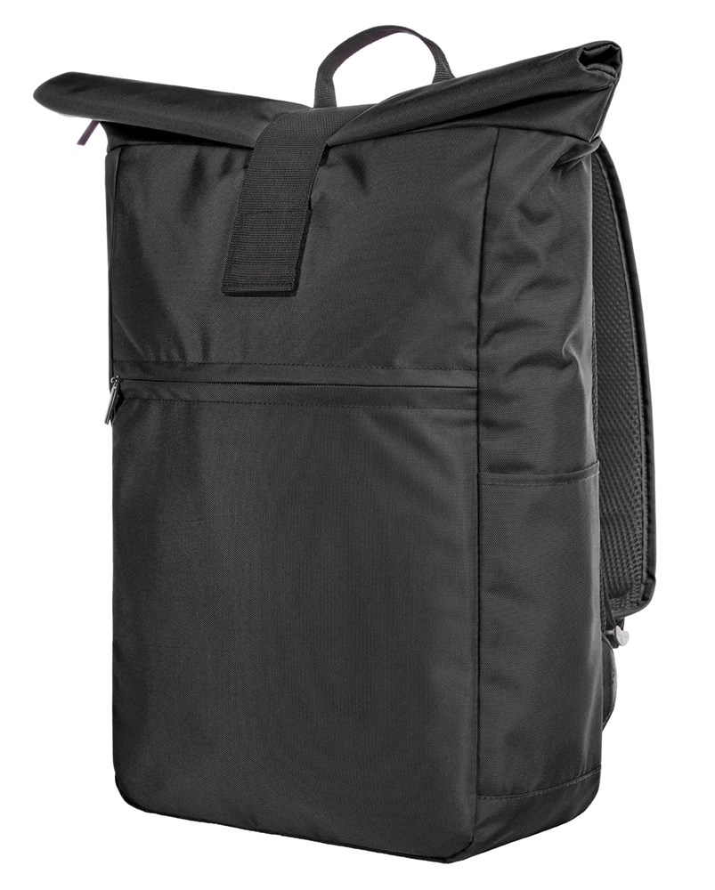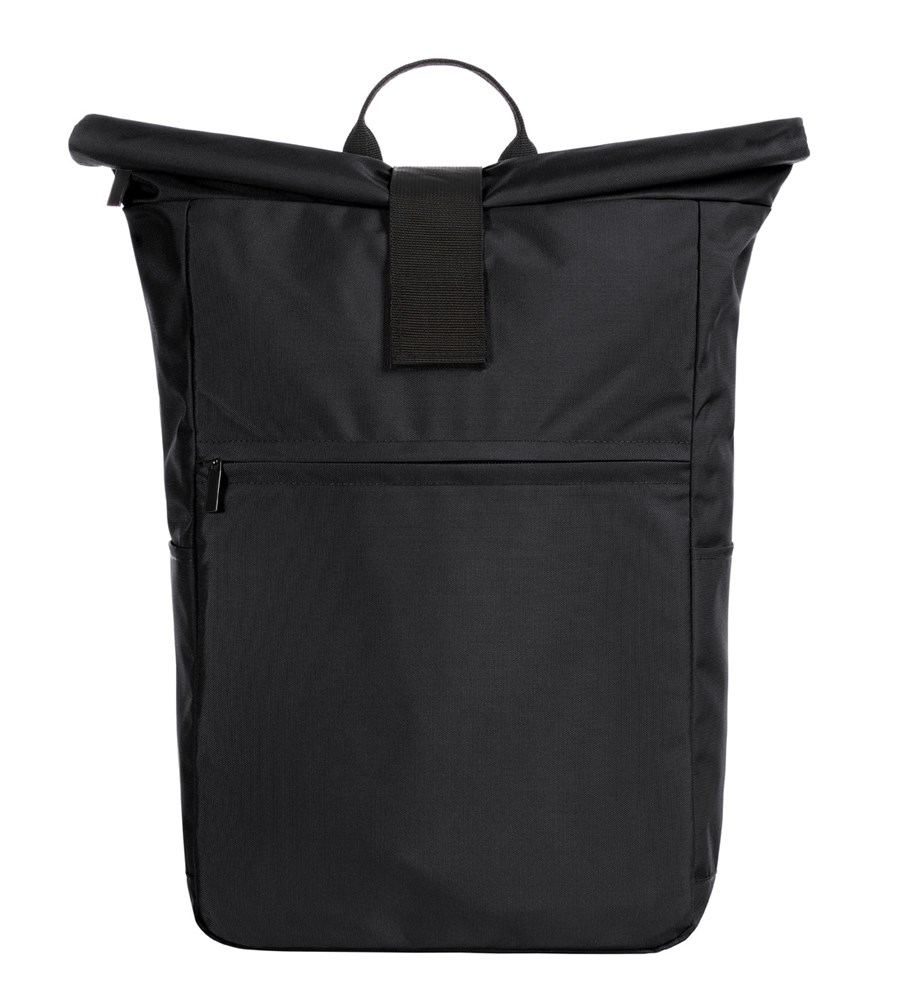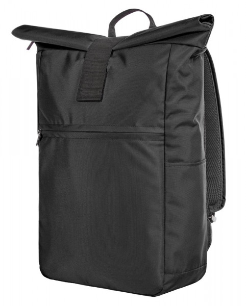 urbaner Überschlag-Rucksack; großes Hauptfach mit Reißverschluss und zusätzlicher Klettlasche; RPET-Obermaterial; gepolstertes Notebookfach und flaches Einsteckfach innen; große Reißverschluss-Vortasche auf der Front; zwei seitliche Einsteckfächer für z.B. Trinkflaschen; gepolstertes Tragesystem; Handgriff