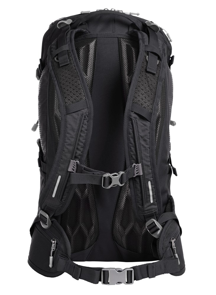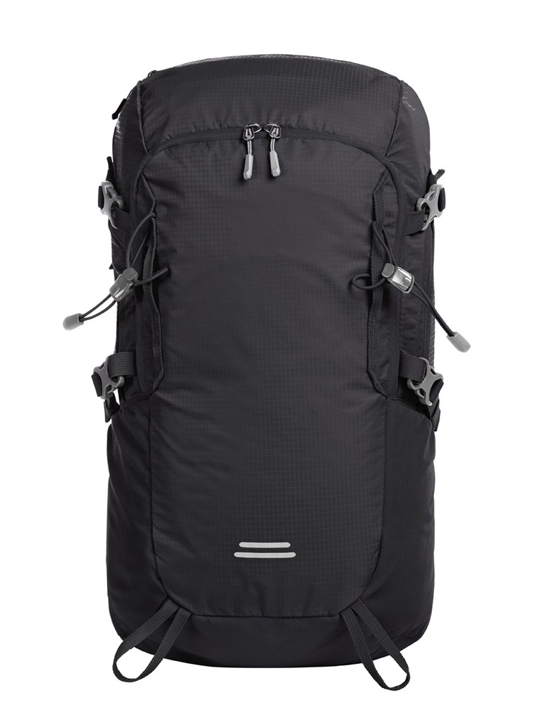leichter, funktioneller Rucksack mit ergonomisch geformtem Rücken und innovativem Wabensystem für ideale Belüftung und Polsterung, oben wie unten höhenverstellbar für eine perfekte Passform; höhenverstellbarer Brustgurt; gepolsterter Beckengurt mit Reißverschlusstaschen; großes 2-Wege-Reißverschluss-Hauptfach mit flachem Einsteckfach innen; rückseitiger Ausgang geeignet für z.B. Kopfhörer oder Schlauch des zusätzlich lieferbarem Trinksystems (Artikel 1812216); Klettloop zur Fixierung des Trinkschlauches; 2 Reißverschlussvortaschen; 2 Netz-Seitentaschen; seitliche Zurrgurte; funktionales Schlaufenband auf der Fronttasche; dekorativer Reflex-Aufdruck; Wanderstockfixierungen; Bodenfach mit Regenhülle; Handgriff