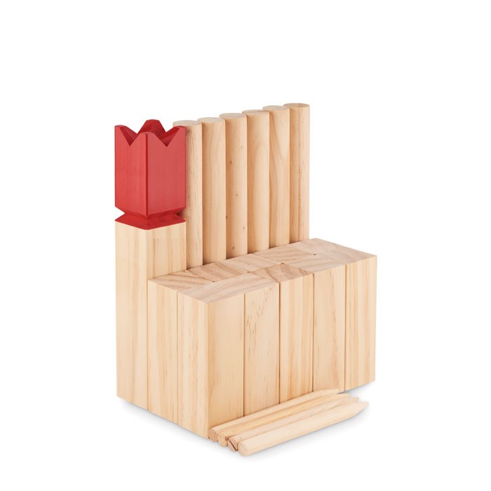Outdoor-Wurfspiel aus Kiefernholz, verstaut in einem Beutel aus Baumwolle mit Kordelzug. Dieses aus Schweden stammende Spiel ist ein großer Spaß für Kinder und auch Erwachsene. Spielen Sie es mit der Familie oder mit Freunden im Freien. Ziel ist es, die größeren Holzblöcke der gegnerischen Mannschaft mit den kleineren umzuwerfen. Der König wird zuletzt umgeworfen. Die Mannschaft, die als Erster die gegnerischen Blöcke umwirft, hat gewonnen. Enthält 10 Bauern, 4 Markierungspfähle, 6 Wurfhölzer und 1 König.