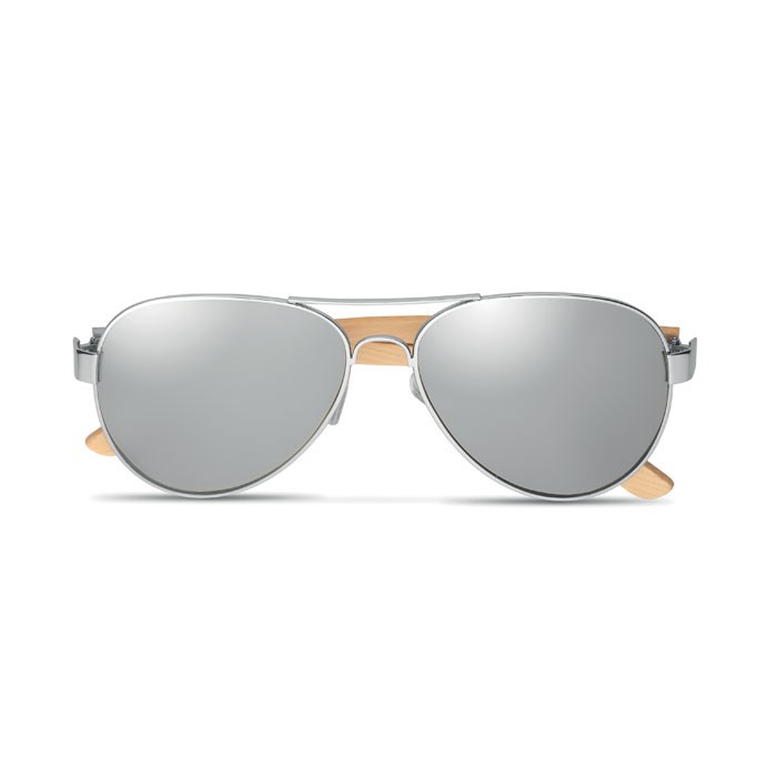 Sonnenbrille mit Bügeln aus Bambus. Farbig verspiegelte Gläser. UV400-Schutz. Inkl. Brillenbeutel aus Mikrofaser Bambus ist ein natürliches Produkt, es kann daher zu leichten Abweichungen in Farbe, Dekor und Maßen kommen.