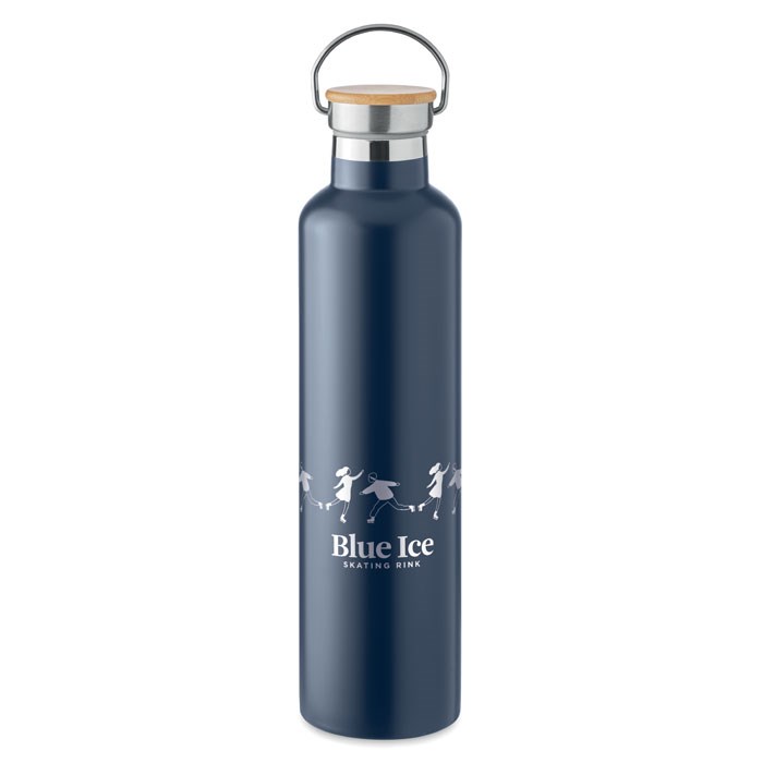 Doppelwandige Isolierflasche aus Edelstahl mit Bambusdeckel und Henkel. Füllmenge: 1000 ml. Bambus ist ein natürliches Produkt, es kann daher zu leichten Abweichungen in Farbe, Dekor und Maßen kommen.
