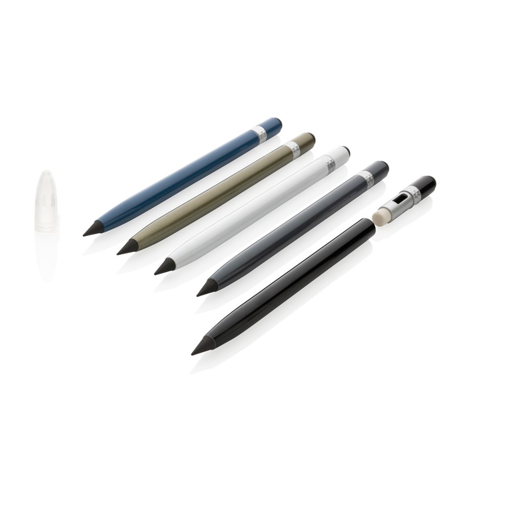 Dieser tintenlose Stift mit Radiergummi ersetzt Ihren traditionellen Holzbleistift. Er hat eine Schreiblänge von bis zu etwa 20.000 Metern mit einer Graphitspitze, um eine Graphitlinie zu erzeugen. Er hat ein sauberes und modernes Aussehen mit Aluminium und auf der Oberseite finden Sie einen Radiergummi.
