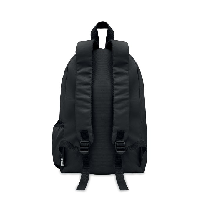 Rucksack mit Reißverschluss-Außentasche. Gepolsterter Rücken und seitliches Flaschenfach. 600D RPET-Polyester.