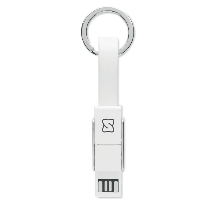 Schlüsselanhänger mit 4in1-Ladekabel. Eingang/Ausgang: 2x Typ-C, Typ-A, Mikro-USB.