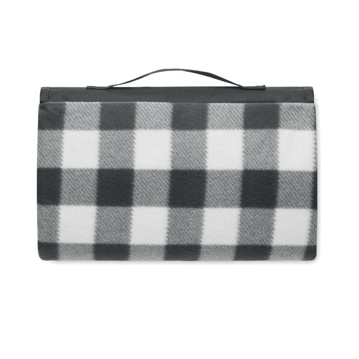 Faltbare Picknickdecke aus RPET Polar-Fleece 150 g/m² mit wasserabweisend beschichteter PEVA-Rückseite. Reißverschlusstasche auf der Vorderseite und kurzer Tragegriff .