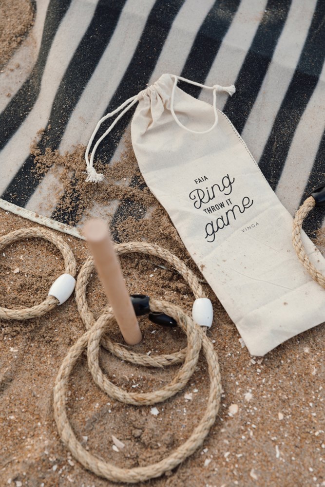 Ein Outdoor-Spiel, das am Strand genauso gut funktioniert wie im Park, verpackt in einer Baumwolltasche mit Netzrückseite, die es leicht zu transportieren macht. Das Spiel besteht darin, Seile in Form von Kreisen auf einen Stock zu werfen, den Sie einfach am Boden befestigen. Die unterschiedlichen Größen der Ringe geben unterschiedliche Punktzahlen. Eine vollständige Bedienungsanleitung ist enthalten.